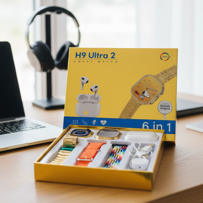 The H9 Ultra 2 Smart Watch – 6-in-1 Combo brings together modern features and a premium look in one complete package. With its original full screen display, the watch provides sharp visuals and smooth touch performance for daily use. This value bundle also includes AirPods 3 Model BT for a seamless wireless audio experience, a durable protective case for the watch, and multiple interchangeable straps to match your style for every occasion. Ideal for fitness tracking, smart connectivity, and routine activities, this set offers comfort, practicality, and a sleek design in one smart solution.